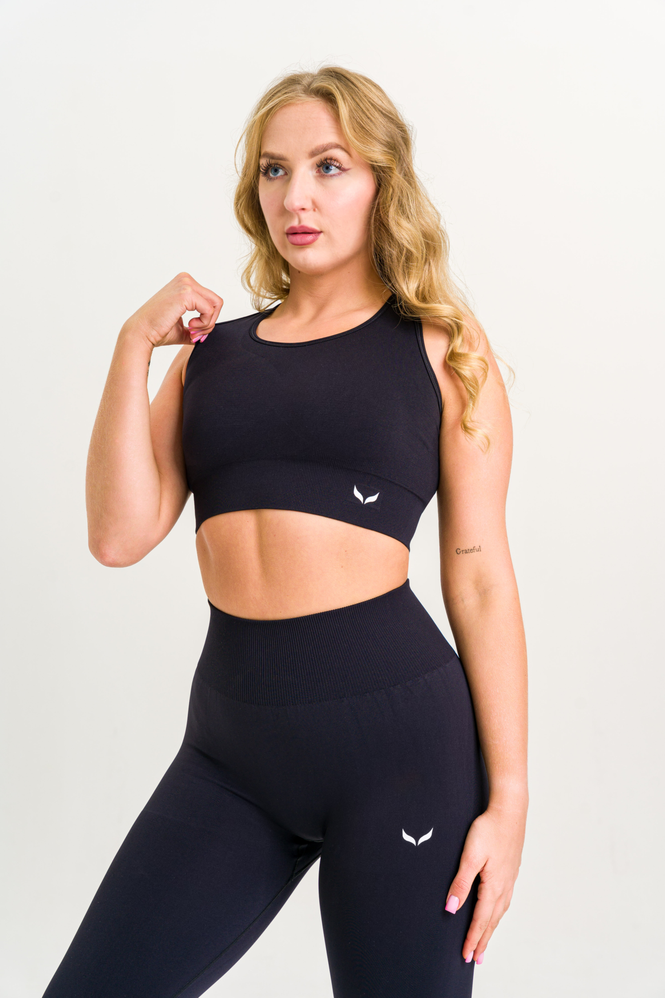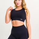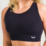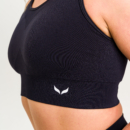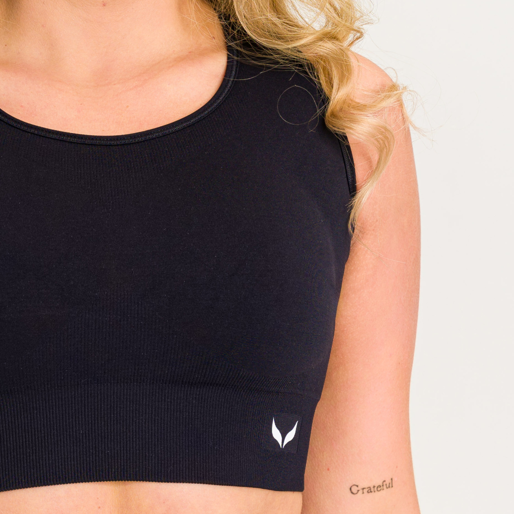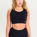 Czarny top sportowy bezszwowy z elastycznym pasem i wyjmowanymi wkładkami. Idealny do ćwiczeń, biegania i treningu siłowego. Przylega do ciała, nie powoduje otarć i podkreśla kobiecą sylwetkę. Oddychający i komfortowy w każdej sytuacji. (Ostatnie sztuki)